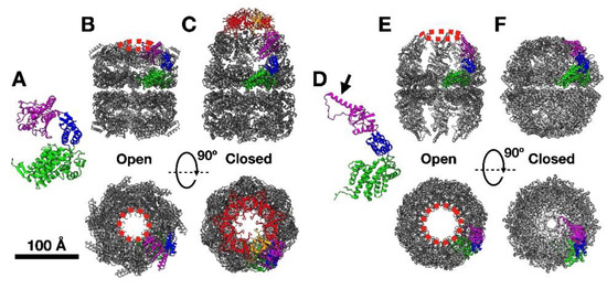 Chaperonins are found in all kingdoms of life, and also in viruses [6,7]. Structurally, the majority of chaperonins are cylinders composed of two back-to-back rings, each of which is an oligomer of ~60 kDa proteins (Figure 1). Each monomer has three domains (Figure 1A,D): (1) the equatorial domain, which hosts the ATP-binding site and is responsible for all inter-ring connections and most of the intra-ring interactions; (2) the apical domain, at the entrance of the ring cavity, which hosts the recognition sites for client proteins; and (3) the intermediate domain, which transduces signals from the equatorial domain (resulting from ATP binding and hydrolysis) to affect the large conformational changes in the apical domain corresponding to the open and closed forms.