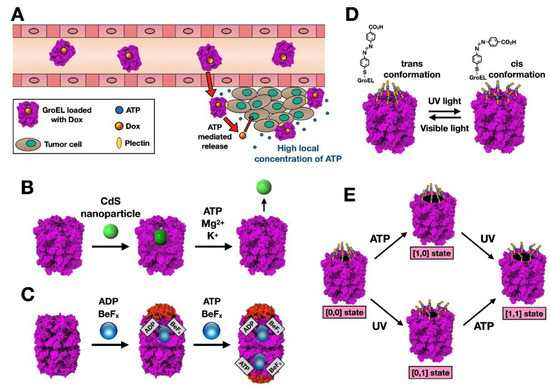 Nanotechnological applications for Type I chaperonins. (A) Proposed mechanism of action for GroEL-Dox in drug delivery and release to tumor cells. Modified from [15]. (B) The chaperonin-enclosed CdS nanoparticles and their ATP-induced release. As shown, CdS nanoparticles can be encapsulated inside of the chaperonin, and released in the presence of ATP and different ions. Modified from [16]. (C) The reaction scheme of nanoparticles encapsulation in the GroEL/GroES complex. In the presence of ADP and BeFx, a 1:1 GroEL:GroES (“bullet”) is formed, while incubation with ATP and BeFx induces the formation of a 1:2 GroEL:GroES complex (“football”). This allows the possibility of caging different nanoparticles in each of the chaperonin’s cavities. Modified from [17]. (D) Structural changes induced by the trans-cis isomerization of azobenzene-modified GroEL. (E) ‘AND’ logic response of azobenzene-modified GroEL to ATP (which induces the chaperonin to an open conformation) and UV (which induces opening of the chemical gate). The chaperonin cavity opens efficiently only in the presence of both stimuli; modified from [19].