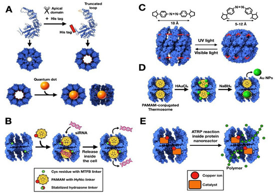 Another example of Type II chaperonins modified for biotechnological purposes is the thermosome of Thermoplasma acidophilum, composed of two homologous subunits, α and β, which alternate in an octameric ring. In this case, the ring can also be formed by β subunit homo-oligomerization, such that all the Cys residues of this subunit are removed from the sequence and a specific one is inserted within the thermosome cavity [20] (Figure 3B). These residues were made to react with the heterobifunctional linker maleimido trioxa-6-formylbenzamide (MTFB). Additionally, the polycationic dendrimer poly(amidoamine) (PAMAM) could be linked to the modified chaperonin, with the dendrimers enclosed in the cavity used to complex siRNA through electrostatic interactions. The siRNA is protected within the chaperonin cavity from RNase attack, and could be delivered to U87 cells inducing gene silencing. The process was made even more efficient by adding the cell-penetrating peptide TAT (QPPRRRQRRKKRG) to the modified chaperonin, which aided in cell uptake and subsequent siRNA delivery [26].