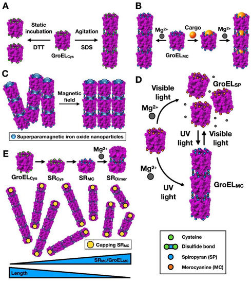 The idea was to achieve filamentous assembly by formation of Cys-Cys bridges between neighbouring GroEL oligomers [35]. Filament formation was improved by rendering the solution mildly hydrophobic by the presence of a detergent such as sodium dodecyl sulphate (SDS) (Figure 5A). Filament formation and disassembly was controlled by the redox conditions. A more sophisticated approach was conducted by the group of Aida [36] to generate large, multiple nanocontainers (Figure 5B). The authors also modified GroEL by introducing in this case a single Cys residue into the apical domain of each of the monomers, at the entrance of the chaperonin cavity. They subsequently reacted those Cys residues with a merocyanin maleimide (MC), which in the presence of Mg2+ induced GroEL filaments. The strategy was to cage the cargo [36,37] before filament formation, which was triggered by the presence of Mg2+. The presence of ATP (and its hydrolysis) induces conformational changes in the chaperonin, which in turn generates a mechanical force and subsequent disassembly of the chaperonin filaments. The rate of disassembly is dependent on ATP concentration, which points to the possibility of selective cargo release, in particular in tumour tissues. This strategy has been used for intracellular distribution of a cargo drug by boronic acid-functionalized chaperonin filaments that are able to penetrate cells [38].