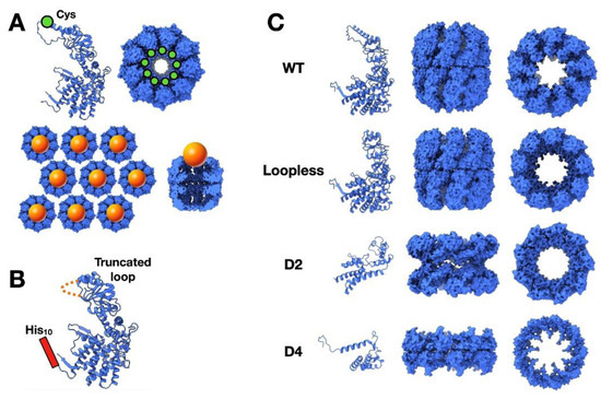 As happens with other biomolecules of regular structure such as DNA and icosahedral viruses, Type II chaperonins have been used as templates for the patterning of arrays [42,43]. These chaperonins have an added advantage over those of Type I in that they are prone to form ordered two-dimensional arrays [44,45,46]. Using this property, the nonameric thermosome from Sulfolobus shibatae was modified to introduce a Cys residue (as in many of the cases described above), this time within the typical helical extension of Type II chaperonins (Figure 6A, left). A thiol group was added through a Cys residue, such that it could interact after generation of the two-dimensional array with QDs made of CdSe-ZnS nanoparticles (Figure 6A, top), thus generating a well-ordered array of nanoparticles located at the entrance of the thermosome cavity (Figure 6A, bottom) [47]. An improvement on this protocol allowed this type of array to be used as a technique for patterning nanoparticles inside the chaperonin cavity [48]. In this case, the helical extension of the thermosome was removed to widen the entrance of the chaperonin cavity (Figure 6B). Then a His10 tag was inserted at the N-terminus of the sequence, which is located in the chaperonin cavity. This smaller chamber has high affinity for metal ions, due to the abundance of His residues (at least 180). When the chaperonin arrays are incubated with Pd2+, the chaperonin cavities become sites for the initiation of chemical reduction of magnetic transition metals such as Ni2+ or Co2+ (from precursor salts). The reaction gives rise to Ni-Pd or Co-Pd nanoparticles, with sizes limited by that of the chaperonin cavity. These artificially, chaperonin-driven arrays could be potentially used for other nanotechnological purposes such as the controlled growth of other materials [48], and may be modified to further widen the cavity entrance by removing part of the apical and intermediate domains, without loss of the general nonameric, double-ring structure (Figure 6C) [49].