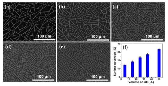 (a–e) Scanning electron microscope (SEM) images of the Ni meshes: (a) NM V-5, (b) NM V-15, (c) NM V-25, (d) NM V-35, and (e) NM V-50; (f) The surface coverage of Ni wire of each Ni mesh sample versus the volume of the ink solution.