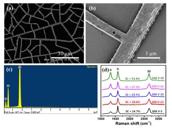 (a,b) The scanning electron microscope (SEM) image of the GM V-50 sample on a SiO2/Si substrate; (c) EDS analysis of the GM V-50 on a SiO2/Si substrate; (d) Raman spectra of GM samples with different SCs of GM.