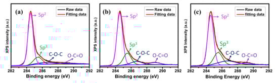 XPS was used to analyze the surface chemical properties of graphene samples. The C 1s XPS spectra of graphene samples (displayed in Figure 3) can be mainly deconvoluted into four types of carbon bonds: the presence of carbon sp2 at 284.5 eV, the presence of carbon sp3 (defect peak) at 285.4 eV, and the presence of the C−O−C and O−C=O functional groups at 286.6 eV and 288.9 eV, respectively [42]. Compared to the planar graphene, the ratios of sp2/sp3 of GM decreased from 7.01 to 4.5 for the GM V-5 and 4.07 for the GM V-50, indicating the presence of high edge in GM samples.