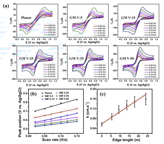 where: is the scan rate (V/s), R (= 8.314 J∙mol−1∙K−1) is the ideal gas constant, T is the room temperature (K), F is 96485.333 C∙mol−1, and is the transfer coefficient between the electroactive compound and the graphene electrode. can be determined from plots of scan rate versus peak position which yields two straight lines with one slope equal to 2.3RT/(1 − nF for the anodic peak, and the another equal to −2.3RT/αnF for the cathodic peak [49] (more information in the Supplementary Materials). According to Equation (2), the electron transfer rate decreases with [43,50]. The k value at each electrode was calculated using Equation (2) and plotted as a function of the edge length in Figure 4c. Note that the edge length of each electrode was determined by Equation (S1), and the edge length of the planar graphene electrode was assumed to be zero. The k value of the planar graphene scattered in ferrocene redox mediator (~0.056 cm∙s−1) is close to the results of CVD graphene reported in [45,48]. As displayed, the k value increases with the edge length. The red line exhibits a linear fitting of k values exhibiting a linear increase of the electron transfer rates from 0.056 to 0.160 cm∙s−1 as the edge length of the GM electrodes increased from 0 to 24.04 m. This result confirms that increasing SC of the GM indeed promotes its EC reactivity because of the increase of graphene edge, where more ions from electrolyte are accumulated [14,23].