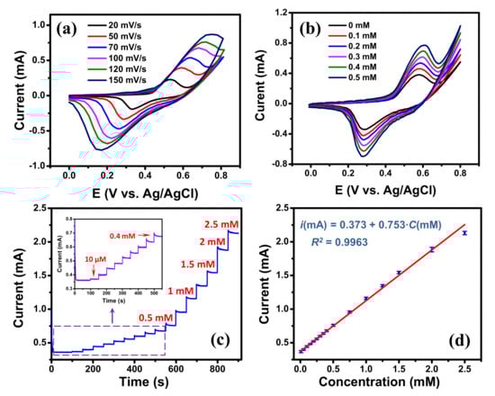 (a) Cyclic voltammograms of the graphene/Ni hybrid mesh V-50 electrode at different scan rates in 0.1 M NaOH; (b) cyclic voltammograms of the graphene/Ni hybrid mesh V-50 electrode under different glucose concentrations (scan rate: 50 mV∙s−1); (c) Amperometric responses of the graphene/Ni hybrid mesh V-50 electrode with addition of glucose every 50 s at 0.6 V, (insert show the magnification of low glucose concentration) with scan rate of 50 mV∙s−1; (d) Linear calibration curve of current response vs. glucose concentration.