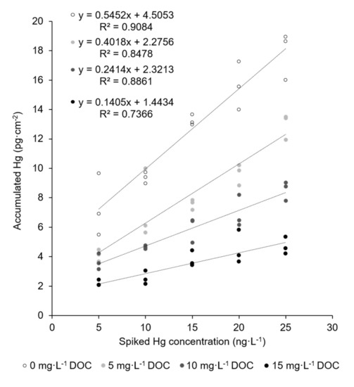 3.4. Mercury Accumulation from Dissolved Organic Carbon Model Solutions