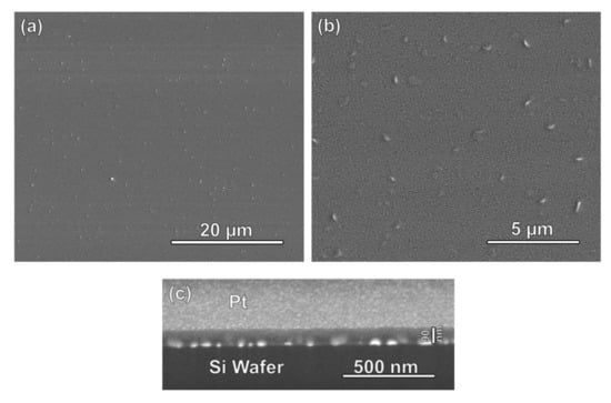 As a substrate for the films, Si wafers (Silicon Materials, P/Bor<100>, Kaufering, Germany) were used. First, 4 × 0.5 cm2 pieces were cut and cleaned by immersion in acetone and ultrasonic treatment. Then, the substrates were cleaned in a warm acetone bath, followed by an isopropanol and ultrapure water bath, and finally dried under an ultrapure N2 flow. These steps were performed in a clean room, where vacuum evaporation of the gold layer was carried out subsequently. As a result, a uniform gold layer with a thickness of about 6 nm was obtained. This thickness was found to be optimum with regard to nanoparticle formation, coverage of protective film, and high gold load, as tested previously [34]. The formation of about 30 nm gold nanoparticles on the silicon substrates was induced by heating the wafers in air to 270 °C on a hotplate for 2 h.