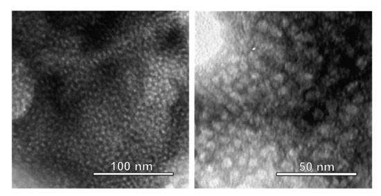 TEM images taken of the mesoporous titania film are shown in Figure 3. Quasi-spherical mesopores with a mean diameter of about 6–7 nm are homogeneously distributed throughout the film. No long-range order can be observed, which is in full agreement with low-angle X-ray diffraction results that do not show any signs of periodicity on the length scale corresponding to the mesopores (results not shown).