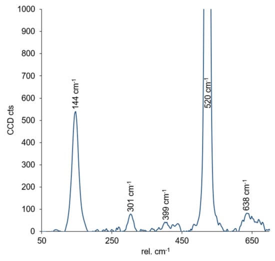 Raman spectroscopy measurements were carried out in order to determine the crystallographic order of the titania. The Raman frequencies for anatase are 144 cm−1 (Eg)*, 197 cm−1 (Eg), 399 cm−1 (B1g)*, 513 cm−1 (A1g), 519 cm−1 (B1g)*, and 639 cm−1 (Eg)* and 143 cm−1 (B1g)*, 447 cm−1 (Eg)*, 612 cm−1 (A1g)*, and 826 cm−1 (B1g) for the rutile phase [38]. The measured Raman spectrum for the titania films on a silicon wafer support is shown in Figure 4. The bands located at 301 cm−1 and 520 cm−1 can be assigned to the silicon wafer [39]. As can be seen, all other Raman bands can be assigned to the anatase phase.