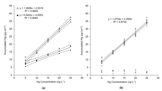 Comparison of Hg accumulation using (a) AuNP@TiO2 sampling stick (Δ) or AuNP@SiO2 sampling stick (•) and (b) different batches of AuNP@TiO2 sampling stick (Δ, □, x) or blank TiO2 sampling stick (○). V= 8 mL (Δ, •) or 6 mL (□, x, ○); tacc= 5 min; shaking speed: 230 rpm. Confidence intervals (dashed lines) were calculated with p = 95% and n = 15 in (a) and n = 45 in (b).
