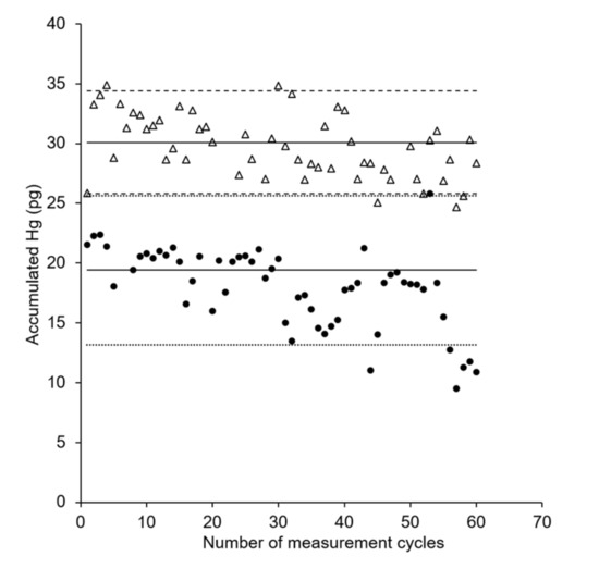 After accumulation, sampling sticks were removed from the caps, rinsed with UPW, and placed in a heatable collector tube coupled online to an atomic fluorescence spectrometer (AFS; Mercur, Analytik Jena AG, Jena, Germany). For thermal mercury release from the sticks, the collector tube is heated, and an argon carrier gas transports Hg vapor to the AFS measurement cell. The timeline of this online procedure and other parameters were set as previously reported in detail by Mutschler et al. [34]. Briefly, AFS measurements were performed at a wavelength of 253.7 nm and a detection voltage of 391 V. External calibration of the AFS was performed using the cold vapor technique (CV) in order to determine Hg masses released from the dipsticks. Elemental Hg0 vapor was generated online using a reduction solution of 1.25% (v/v) HCl containing 0.65% (w/v) SnCl2 and a carrier solution of 0.5% (v/v) HCl. Hg2+ standards were prepared freshly by adequate dilution of a stock standard. The sample volume used for calibration was 2.3 mL. The external calibration function is given as y = 0.000813 L·ng−1 x + 0.000183 (R2 = 0.9995). The resulting limit of detection for CV-AFS is 0.255 ng Hg L−1.