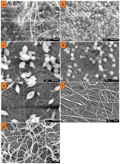 SEM micrographs of nanofibers obtained at different concentrations of PCL in nanofibers: (a) 8%, sample T8_0 solvent ethanol instead of acetone; (b) 8%, sample T8_2; (c) 10%, sample T10_2; (d) 12%, sample T12_2; (e) 15%, sample T15_2; (f) 20%, sample T20_2; (g) 25%, sample T25_2.