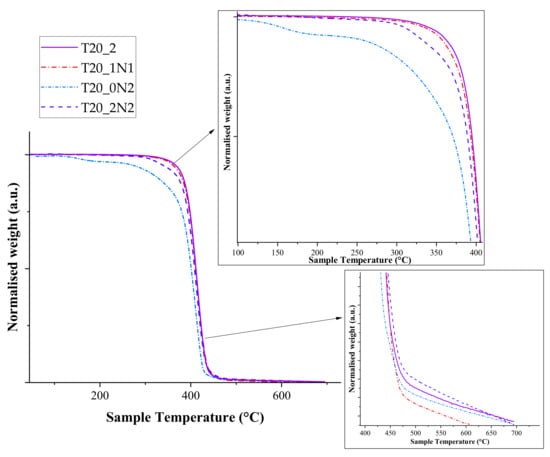 Sample T20_0N2, prepared under a relatively low concentration of TiN NPs (2 mL at 0.15 mg mL−1), started to degrade at a lower temperature of about 100 °C, which could be attributed to an insufficient number of NPs within the fibers matrix to dissipate heat. The increase in concentration of TiN NPs improved the stability of nanofibers at low temperatures due to the increase of heat capacity. Here, sample T20_0N6 with the highest concentration of TiN NPs (2 mL at 0.45 mg L−1) demonstrated similar degradation behaviour to pristine nanofibers. It should be also noted that most of the organic part degraded at the end of the program cycle. Indeed, about 0.1% of the initial mass was available at the cycle’s end for pristine nanofibers, while the relevant values for functionalized nanofibers were in the range of 0.2–0.35%.