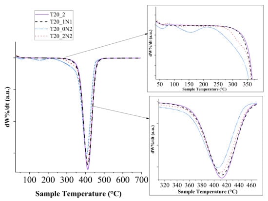 As one can see from derivative thermogram (DTG) curve of the hybridized nanofibers (Figure 5), the presence of NPs at lower concentrations in the nanofibers (T20_1N1) did not affect the temperature at which the maximum mass loss event takes place, but the increase in the amount of NPs led to the decrease of this temperature by several degrees. The latter fact can be explained by the increase of heat transfer over the nanofibers due to the presence of inorganic TiN NPs in the matrix. As shown in the figure, the maximal mass loss event occurred at 412 °C for the pristine and nanofiber sample T20_1N1, while for T20_0N2 and T20_0N6 it took place at 406 °C and 409 °C, respectively.