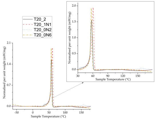 Differential scanning calorimetry (DSC) tests were then undertaken to further examine the changes in thermal behaviour of functionalized nanofibers. The samples were analysed during two heating cycles, but we did not reveal differences between data from these cycles. DSC data from the first heating cycle are shown in Figure 6. Typical DSC curves for all examined samples are shown in Figure 6. Here, one can see that the peaks were endothermic without mass loss for pristine and functionalized nanofiber samples, indicating the melting phase of PCL. We observed slight differences between peaks for pristine and functionalized nanofibers. Here, phase change (melting temperature, Tm) for pristine nanofibers and sample T20_1N1 was observed at 57.5 and 59 °C, respectively. The area under the peak showing enthalpy change (ΔH) was measured at 9.5 mWmg−1 for pristine nanofibers, while nanofibers functionalized at the lowest concentration of TiN NPs (T20_1N1) demonstrated a very slight increase in enthalpy up to 11.4 mWmg−1 (Figure 6). Nanofibers functionalized with TiN NPs at higher concentrations (T20_0N2 and T20_0N6) demonstrated similar behaviour, while the Tm decreased slightly from 57.8 °C to 57 °C under the highest concentration of TiN NPs. The respective change in enthalpy ΔH was 8.9 mWmg−1 and 8.3 mWmg−1 for samples T20_0N2 and T20_0N6, respectively. Such a trend was consistent with results of TGA/DTG analysis. It should be noted that there was a slight dip in curves observed for all samples when the heating program goes above 120 °C, which could be attributed a change in samples’ weight due to volatilization. No other phase change behaviour was observed until the end of the program at 200 °C.
