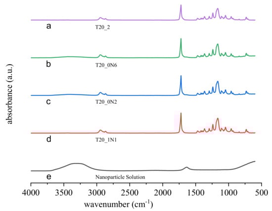 Fourier Transform Infrared Spectroscopy/Attenuated Total Reflection (FTIR/ATR) graphs of nanofiber samples prepared at different concentrations of TiN NPs. (a) reference fibers T20_2; (b) fibers prepared under 2 mL of 0.45 mg L−1 of TiN NPs, sample T20_0N6; (c) fibers prepared under 2 mL of 0.15 mg L−1 of TiN, sample T20_0N2; (d) fibers prepared under 1 mL of 0.15 mg L−1 of TiN NPs, T20_1N1; and (e) nanoparticle solution.
