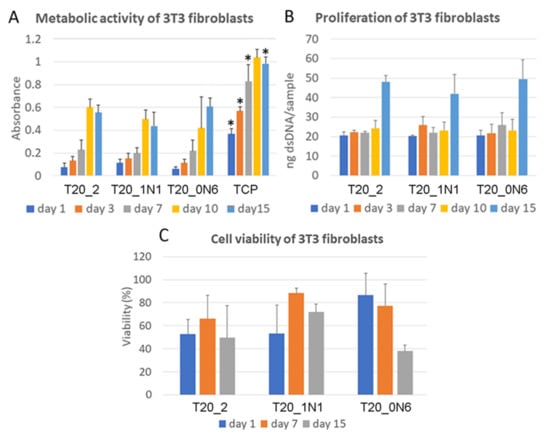 In MTS assays, absorbance increased every experimental day from day 1 until day 15 for all scaffolds. As shown in Figure 8a, there were no significant changes to the metabolic activity of mouse 3T3 fibroblasts immobilized on the scaffolds from day 1 until day 10. On day 15, higher absorbance was observed for the sample prepared at a higher concentration of TiN NPs (T10). Moreover, higher absorbance compared with that of the other samples was observed for tissue culture polystyrene (TCP), which is often used to improve cell culture viability.