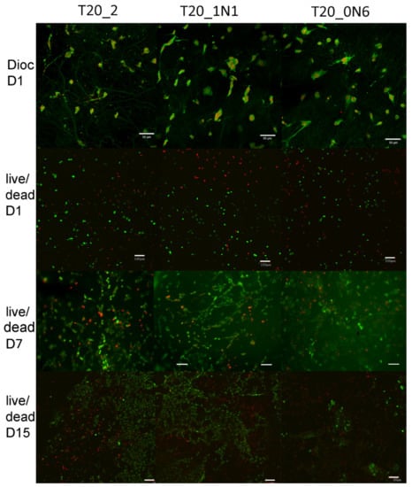 Adhesion and viability of 3T3 cells. On day 1, cell adhesion was labelled using DiOC6(3) staining (green) for plasma membranes visualization and propidium iodide staining (red) for cell nuclei (Dioc D1). As shown in the images, 3T3 cell adhered well and spread on all scaffolds. On day 1 and 15, live/dead staining was carried out using 2′,7′-Bis(2-carboxyethyl)-5(6)-carboxyfluorescein acetoxymethyl ester (BCECF-AM) staining (green viable cells) and propidium iodide (red nuclei of dead cells). Cells were visualized using the confocal microscope Zeiss LSM 880 Airyscan. Obj. 20x, bar = 50 µm for Dioc D1 staining and Obj. 10x, bar = 100 µm for live/dead staining.