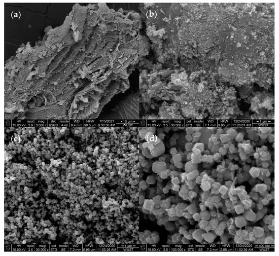 It can be seen from the SEM images that the corn cob biochar in Figure 1a,b shows that the corn cob biochar has a unique pore structure and contains a graphene-like layer structure, which can provide active sites for the loading of β-FeOOH and Fe3O4. It can be seen from Figure 1c,d that the catalyst is attached to the surface of the biochar in the form of nanoparticles and nanorods, and the loading of the catalyst does not change the morphology of the biochar. Among them, Fe3O4 is loaded on biochar with nanoparticle sizes of 15–30 nm, and β-FeOOH is loaded on biochar in a rod shape [27].