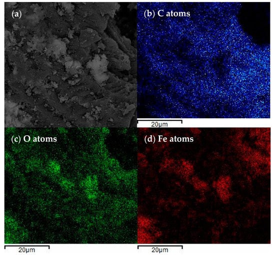 The spatial distribution of elements, dispersive energy X-ray (EDX) spectrum, and element mapping is shown in Figure 2, where Figure 2b shows the distribution of C atoms, Figure 2c shows the distribution of O atoms, and Figure 2d represents the distribution of Fe atoms. It can be seen from the figure that the C, O, and Fe atoms are uniformly distributed, indicating that the catalyst is evenly combined with biochar, which also corresponds to the SEM results [29].