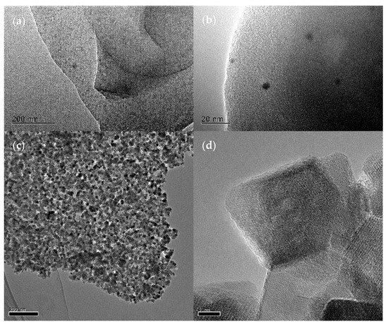 TEM images of biochar and β-FeOOH/Fe3O4/biochar: (a,b) TEM images of biochar. (c,d) TEM images of β-FeOOH/Fe3O4.