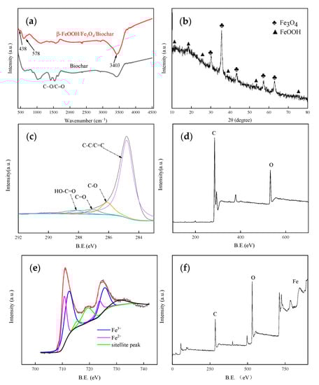 (a) FTIR spectra analysis image. (b) XRD spectra analysis image. (c,d) XPS spectral analysis image of biochar. (e,f) XPS spectra analysis image of β-FeOOH/Fe3O4/biochar.