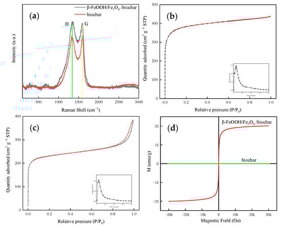 (a) Raman spectral analysis image. (b) Nitrogen adsorption–desorption isotherms of biochar; the inset is the pore size distribution. (c) Nitrogen adsorption–desorption isotherms of β-FeOOH/Fe3O4/biochar; the inset is the pore size distribution. (d) Vibrating sample magnetometer (VSM) pattern of β-FeOOH/Fe3O4/biochar.