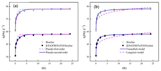 According to Figure 6a and Table 1, the adsorption of MO by biochar and β-FeOOH/Fe3O4/biochar is fitted with a pseudo-second-order kinetic model. The linear correlation coefficient is 0.99, which is similar to the pseudo-first-order kinetic model. Compared with the correlation coefficient obtained by fitting 0.87, the fitting effect is better. The pseudo-second-order kinetic equation also shows that the sharing or exchange of free electrons occurs during the adsorption process, and chemical adsorption involving covalent forces occurs. In β-FeOOH/Fe3O4/biochar, the combination of β-FeOOH and carbon quantum dots will reduce the adsorption performance, but can enhance the ability of electron sharing.