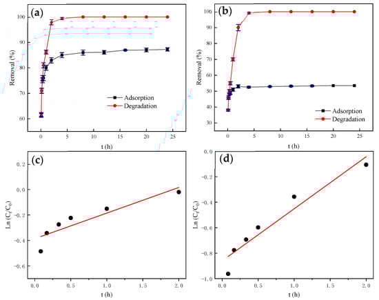 Figure 6a,b are the results of shading adsorption of biochar and β-FeOOH/Fe3O4/biochar composites. In the shading adsorption experiment, the adsorption capacity of biochar is better than that of the catalyst. First, in the same quality of β-FeOOH/Fe3O4, the mass of biochar only accounts for two-thirds of the total mass. Second, when the β-FeOOH/Fe3O4 is loaded on the biochar, the β-FeOOH/Fe3O4 will block the pores on the biochar or occupy the oxygen-containing functional groups on its surface. This can also be directly reflected in the results of the specific surface area.