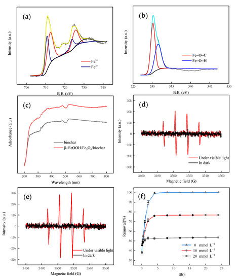 It can be seen from Figure 8d,e that both biochar and β-FeOOH/Fe3O4/biochar can produce a characteristic peak of 1:2:2:1 under visible light. This characteristic peak indicates that biochar and β-FeOOH/Fe3O4/biochar generated under visible light are hydroxyl radicals. Among them, β-FeOOH/Fe3O4/biochar is stronger than the characteristic peaks produced by biochar, which indicates that β-FeOOH/Fe3O4/biochar can transfer photo-generated electrons and generate free radicals faster under visible light, which improves the photocatalytic efficiency.