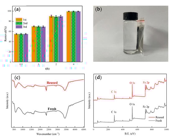 It can be seen from Figure 9c,d in the FTIR and XPS diagrams of β-FeOOH/Fe3O4/biochar before use and after the third use that the structure of β-FeOOH/Fe3O4/biochar has no special effects, which also verifies that β-FeOOH/Fe3O4/biochar can maintain excellent photocatalytic activity after reuse [42].