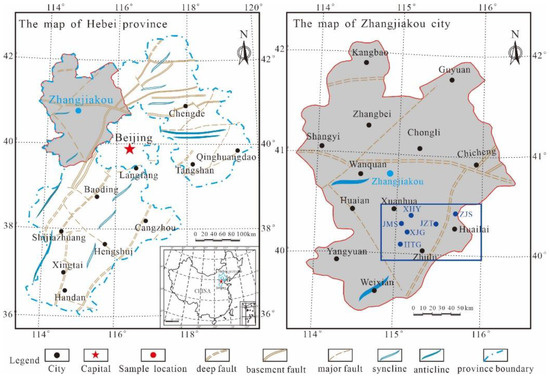 In total, 18 fresh outcrop shale samples from the six villages of Zhaojiashan, Jizhentun, Xiajiagou, Huangtugang, Jimingshan, and Xiahuayuan were collected for the precursory studies. The six sections all include organic-rich Xiamaling marine shale, and the locations are marked in Figure 1. The experimental samples were mainly black and carbonaceous shale. During the sample collection process, fresh samples were collected 2–3 m below the surface. As the experimental samples were collected from the outcrops of the Xiamaling shale in Zhangjiakou, any weathered surface material on the collected samples was removed, and the samples were thoroughly cleaned using ethanol to remove possible surface contamination. Each of the selected samples was split into several aliquots for analysis of the mineralogical composition, pore morphology, and pore size distributions, for organic petrographic analysis, and the extraction of residual hydrocarbon.
