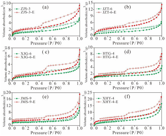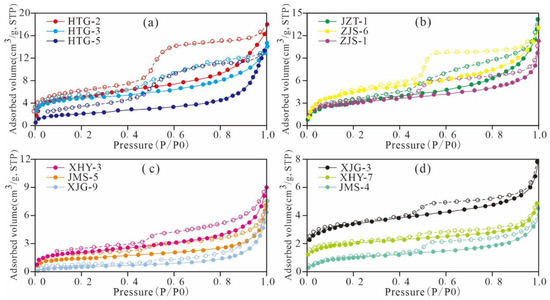 In this study, the morphological characteristics from the low-pressure N2 adsorption curves of shale samples from the Xiamaling Formation were statically analysed. According to the IUPAC classification, the samples were generally classified into four types (Figure 3). The first type is represented by HTG-2, HTG-3, and HTG-5. The curves exhibit a certain amount of N2 adsorption and a wide hysteresis loop, which corresponds to type H2 isotherms as defined by IUPAC [37]. The second type is represented by JZT-1, ZJS-6, and ZJS-1. The curve shape is similar to that of the first type of curve, but the curves exhibit a large adsorption capacity at P/P0 of approximately 0.995, demonstrating an unsaturated adsorption state and a large hysteresis loop, which is similar to type H2 but has the characteristics of type H3 as defined by IUPAC [37]. The results indicate that these samples have larger pores than the first type, including wedge or V-type pores with both ends open. The third type is represented by XHY-3, JMS-5, and XJG-9. These curves exhibit a certain adsorption content at the low-pressure and high-pressure stage and are steeper at saturated vapour pressure. The hysteresis is narrower than those of the aforementioned two types and close to that of type H3, as defined by IUPAC [37]. The results show that the pores are mainly flat slit structures, cracks, and wedge structures, and the hysteresis loop is mainly related to clay and other flaky granular materials. The fourth type is represented by XJG-3, XHY-7, and JMS-4. These curves are less to the third type of curve, except the increment at the saturated vapor pressure is smaller than that of the third type. These curves are similar to the H3-type curve defined by IUPAC but exhibit the characteristics of the H4-type curve [37] The results show that the pores are slit-shaped pores and wedge-shaped semi-closed pores with parallel walls, and a certain amount of ink bottle-shaped pores are noted.