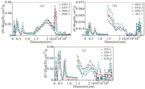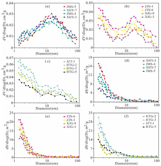 The PSDs of the Xiamaling shales calculated by the BJH model are presented in Figure 4. The plot of dV/d(logD) versus D clearly reveals that the PV is mainly contributed by the mesopores and micropores and can be divided into three types. The first type is represented by JMS-5, XHY-7, JMS-4, and XHY-3. The TOC of the samples is less than 1.0%, and the clay mineral content is high. The PV distribution is post-peak type, indicating that fewer micropores were generated and that the mesopores were more developed. This finding is attributed to the fact that the samples with low TOC content did not contain the numerous micropores generated by hydrocarbon generation of OM. Clay minerals provide a small number of micropores and a large number of mesopores. The second type is represented by ZJS-1, ZJS-6, XJG-3, and XJG-9. The TOC content varies from 1.0% to 3.0%, and there is a low content of clay minerals. The PV exhibits a bimodal distribution. The main maximum value is distributed in the range of 1–10 nm diameter, and the other is distributed at 2–10 nm diameter. The results showed that the micropores and narrow mesopores in these samples were more developed and contributed the most to the PV. The third type is represented by JZT-1, HTG-2, HTG-3, and HTG-5. The TOC content is greater than 3.0%, and the clay mineral content is much lower than that of the second type. The PV exhibits a pre-peak distribution, indicating that the micropores of these samples are more developed and constitute most of the PV.