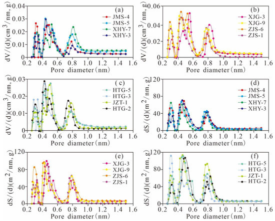 The micropore size distribution of the Xiamaling shale obtained by the DFT model exhibits a high log differential PV and SA and similar distribution characteristics (Figure 6). There are three stable peaks at approximately 0.3~0.4 nm, 0.45–0.6 nm and 0.7~1.0 nm, which exhibit the same increasing and decreasing tendencies. The peak values of PV and SA generally increase with TOC content, which indicates a high abundance of micropore distributions of the corresponding pore size, and the abundance of micropores increases with increasing TOC content. Furthermore, micropores sized 0.45–0.7 nm are the most prevalent in the distribution, and pores with diameters of approximately 0.3~0.45 nm and 0.7~1.0 nm also significantly contribute to the PV and SA, respectively.