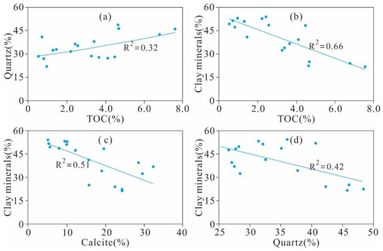 The TOC content of 18 shale samples exhibits a weak correlation with the quartz content (R2 = 0.32, Figure 7a), which is also observed in Longmaxi shale from the Sichuan Basin in South China and Devonian shale samples from the Horn River Basin [23,38]. The positive relationship indicates that the quartz is of biogenic origin. Additionally, the TOC content exhibits a negative correlation with clay minerals (R2 = 0.66, Figure 7b). Pan et al. [39] reported that a negative correlation is observed for samples with TOC content < 12.0%, whereas a positive correlation exists for the samples with TOC content > 12.0%. Accordingly, more samples with higher TOC contents are needed to completely estimate the relationship between the TOC content and clay minerals in the Xiamaling shales. In addition, the clay minerals of the Xiamaling shale exhibited marked negative relationships with calcite content (R2 = 0.51, Figure 7c) and quartz content (R2 = 0.42, Figure 7d).