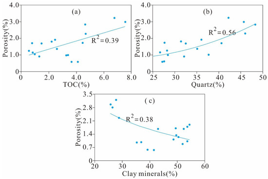 Figure 9a demonstrates that the total porosity is weakly positively correlated with the TOC content, indicating that OM plays a significant positive role in the total porosity but is not the most essential controlling factor. The positive relationship between the total porosity and TOC content was previously mentioned by many scholars [23,24,41], and some studies have reported that the total porosity is positively correlated with the TOC content but is negatively correlated with increasing TOC content for samples with TOC content higher than a certain value owing to diagenesis and compaction [19,39].