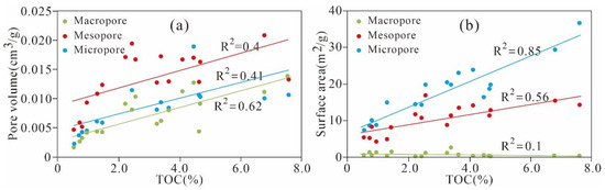 Relationship between the TOC content and pore structure in Ximaling shale ((a): pore volume; (b) surface area).