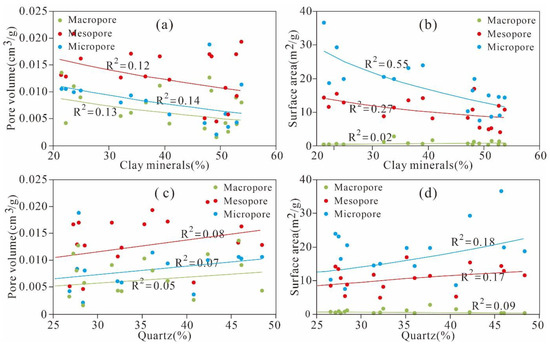 As shown in Figure 11a,b, a relatively weak negative correlation is observed between the clay minerals and PV of the micropores, mesopores, and macropores (R2 = 0.14, 0.12 and 0.13, respectively). The SA of the micropores and mesopores is negatively correlated with the clay minerals (R2 = 0.55, 0.27), whereas the macro-PV exhibits no correlation with the clay minerals. The negative correlations between the clay mineral content and the PV and SA may be caused by the decrease in pore space that occurs because various pores are filled as the clay mineral content increases.