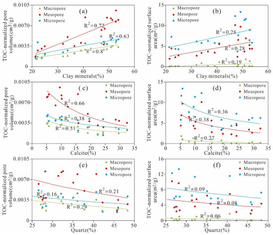 TOC-normalized PVs and SAs of different scales versus the (a,b) clay mineral content, (c,d) calcite content, and (e,f) quartz content.