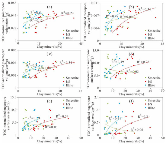 Different clay mineral compositions versus the TOC-normalized PV of the (a) micropores, (b) mesopores, (c) macropores and the TOC-normalized SA of the (d) micropores, (e) mesopores, (f) macropores.