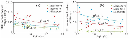 To obtain information about the effect of thermal maturity on the nanoscale pore structure, this research estimated the relationship between the TOC-normalized PV and SA of different nanoscale pores of Ximaling shale (Figure 14). The results show that the TOC-normalized PV of micropores, mesopores, and macropores are negatively correlated with EqRo (R2 = 0.21, 0.28 and 0.32, respectively). The TOC-normalized micropores and mesopore SAs have a relatively weak negative relationship with EqRo (R2 = 0.16 and 0.24, respectively), whereas EqRo has a weaker negative effect on the TOC-normalized macropore SA (R2 = 0.05). The thermal maturity reflects the dual effects of compaction and time experienced by shale. According to Liu et al. [29], the Xiamaling shale in Zhangjiakou, Hebei has been in a slow subsidence and deep burying state for a long time since its deposition to the end of the Carboniferous; then, this shale started lifting at the beginning of the Permian and subsided rapidly in the middle of the Cretaceous. The negative relationship between EqRo and the TOC-normalized PV and SA of different nanoscale pores of the Ximaling shale is predominantly due to the deep progressive burial and compaction of the shale.