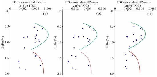 Evolution of TOC-normalized (a) micropore, (b) mesopore, and (c) macropore volume with the equivalent vitrinite reflectance.