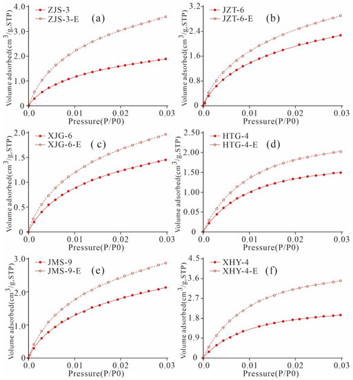 The CO2 adsorption isotherms of the Xiamaling shale exhibit similar trends and variations (Figure 5), which manifest as type I according to the IUPAC and are characterized by microporous solids [37]. Obviously as TOC content increases, the maximum volume of the CO2 adsorption content increased from 0.83 to 2.96 cm3/g, indicating that the number of micropores increased with increasing TOC content.