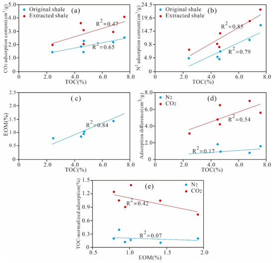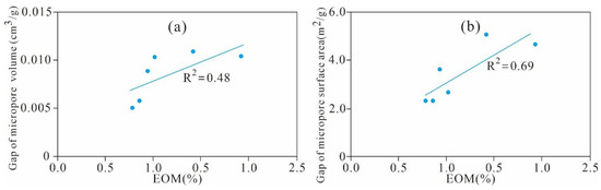 As shown in Figure 22, the extractable OM (EOM) is significantly positively correlated with the gap value of the micro-PV (R2 = 0.48) and SA (R2 = 0.69). This finding indicates that residual hydrocarbon is one of the main controlling factors for the formation and development of the micropore PV and SA of Xiamaling shale; a higher residual hydrocarbon content occupies a larger micropore SA and PV and results in a larger increase in the micropore SA and PV in the extracted samples.