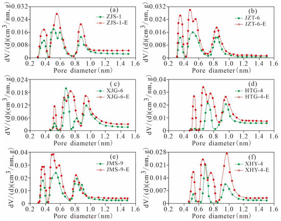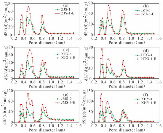 Micropore SA of the original shale and its corresponding extracted sample varies with pore size ((a), ZJS-3; (b), JZT-6; (c), XJG-6; (d), HTG-4; (e), JMS-9; (f), XHY-4).