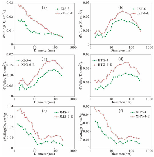 As shown in Figure 23, the meso- and macro-PV of the extracted samples are significantly greater than those of the original shales. ZJS-3, JMS-9, XHY-4 and their extracted samples are of the pre-peak type (Figure 23a,e,f). The pores with smaller diameters contribute relatively more to the PV, and the pores with diameters less than 10 nm contribute the most to the PV. The micropores and mesopores with small diameters constitute the majority of the PV. The PV distributions of JZT-6, XJG-6, and HTG-4 are bi-peak with 2 maximum values at 2 nm and 40 nm and are dominated by the latter (Figure 23b–d).
