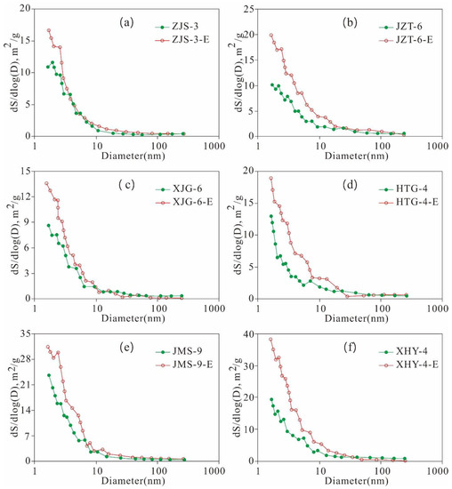 Mesopore and macropore SA of the original shale and its corresponding extracted sample varies with the pore size ((a), ZJS-3; (b), JZT-6; (c), XJG-6; (d), HTG-4; (e), JMS-9; (f), XHY-4).
