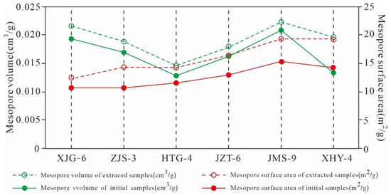 Mesopore SA and PV variation characteristics of the original shale and its corresponding extracted samples.